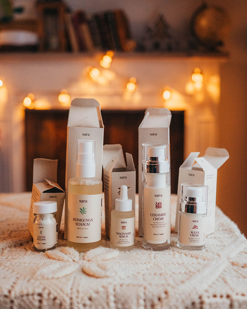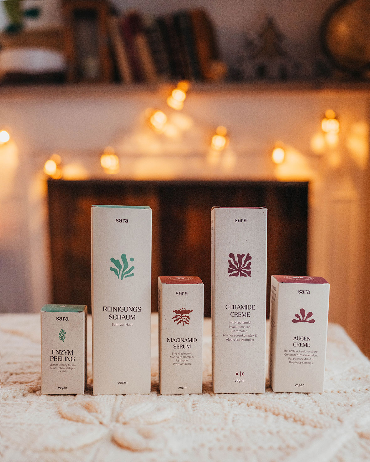 - 1 x Enzympeeling, 1 x Reinigungsschaum, 1 x Niacinamid-Serum (5 %), 1 x Ceramide Creme, 1x Augencreme